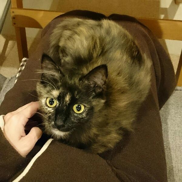 椅子に座っていると、カラさんはひょいひょい登ったり降りたりしますが、メルさんは足元をうろうろするだけなので。