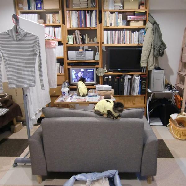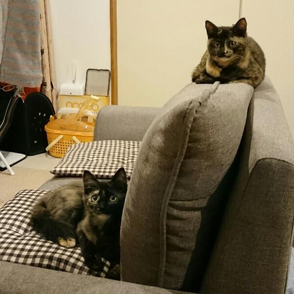 ソファーが届いたのが避妊手術の数日後で、二人がナーバスになってる(特にカラさん)ときに新たな家具を入れるのはどうかなー? とチラリと考えましたが、入れてみたら一日だけ警戒して、すぐに慣れました。