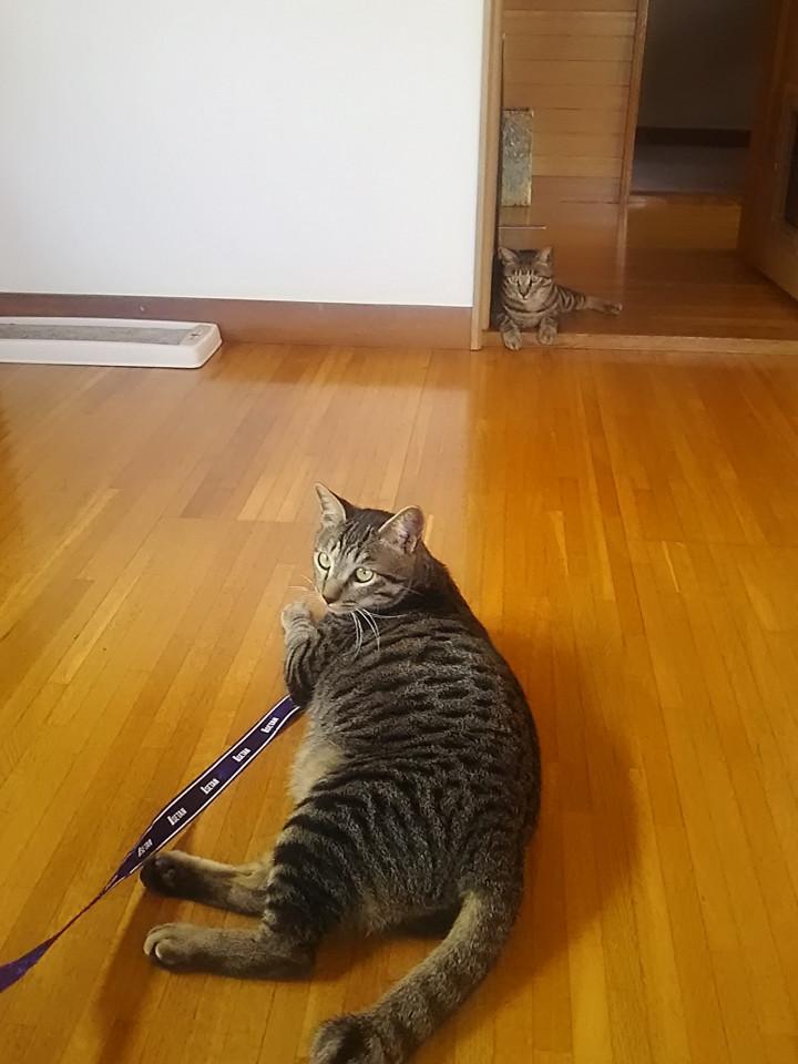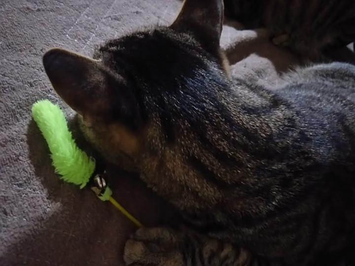 たまに無言の抵抗(しっぽボム!)をしても一撃でオモチャを奪われ、部屋の隅へ…ケガしないように遠巻きに順番を待ちます。