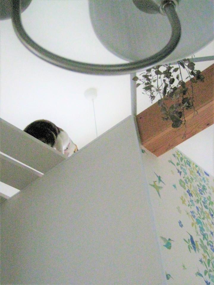 ハナちゃん、壁の向こうの階段を見下ろしています。