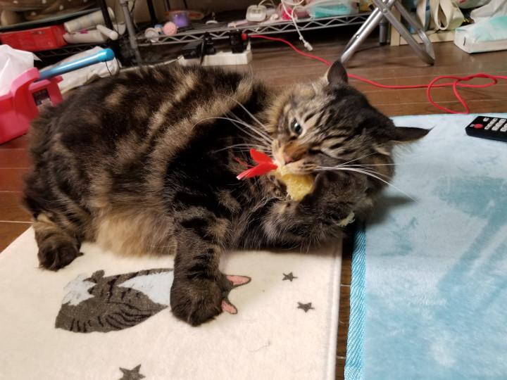 きなこが魚で、おはぎがエビフライのつもりで買ったけど2匹ともエビフライが気に入ったご様子♥️