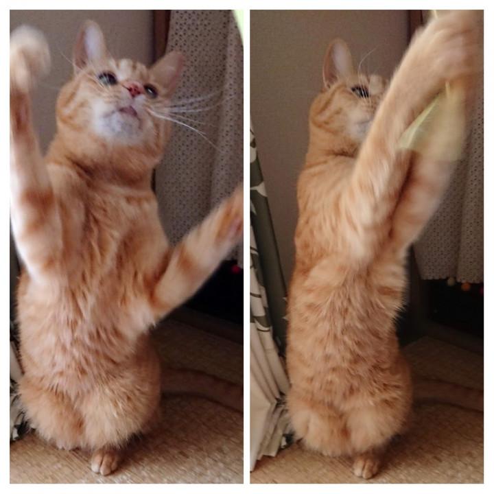 目の前で揺らす→チョイチョイ、カミカミ(じゃらしのみ。PPバンドやメジャーは幸い噛まず)、捕獲(笑)。