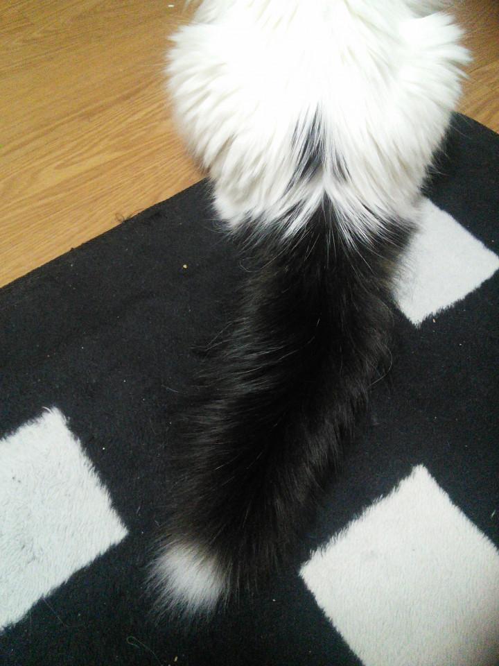 私の推測ですが、ちょむがお母さんのお腹の中で毛の色が沈着していく時に、誤ってしっぽの先が腰にチョンとついてしまい、色が移ってしまったのではないかと……