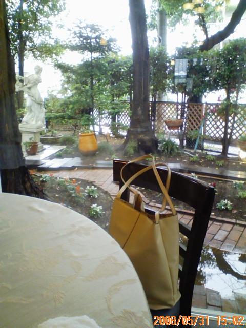 テラス越しに見える庭は綺麗で、雨に濡れています。