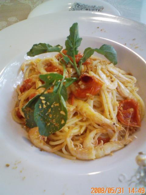 4種類のメニューから、「‥‥‥ペペロンチーノ」を選びました。えびもカリカリして美味しいけれど、ソテーしたトマトが、アクセント、ペペロンチーノ味を食べたり、トマト風味を食べたり、一皿が飽きないの。