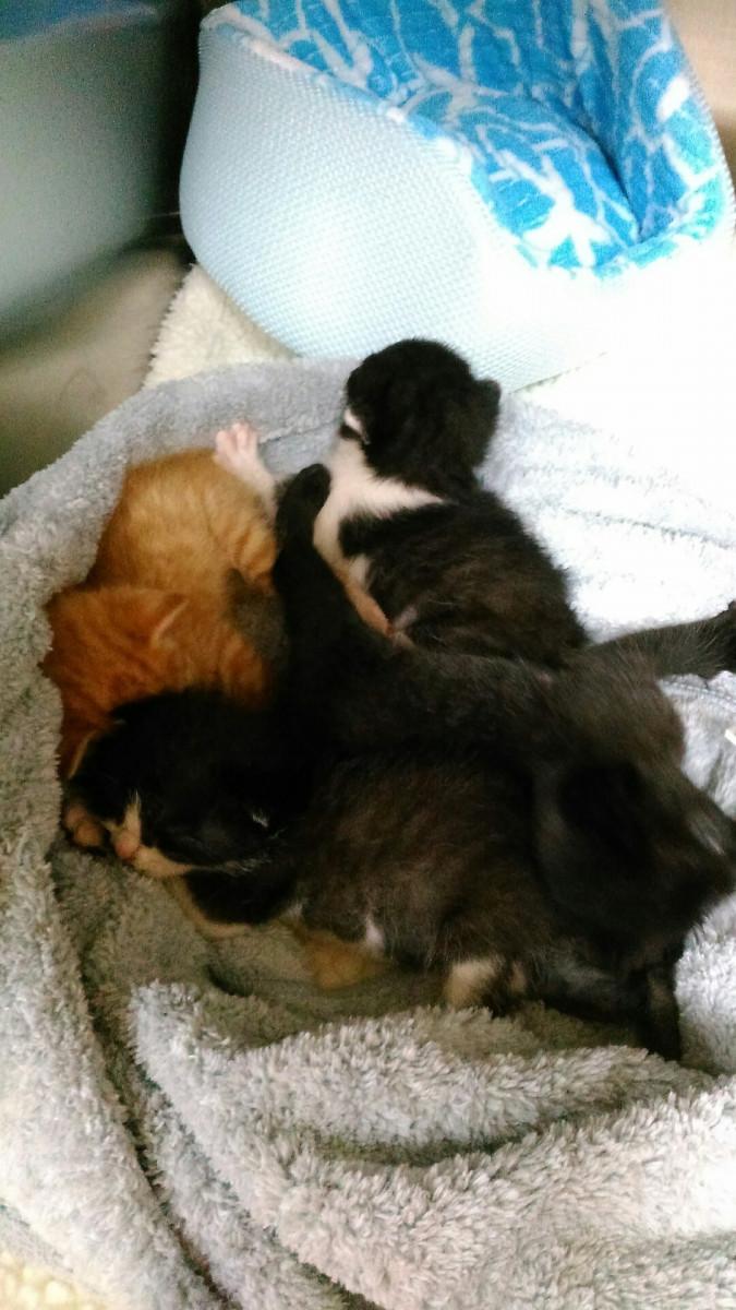 が、今回の子たち、2匹はもう歯が生えているし、もう2匹も切歯がうっすら見えている。生後3週間程度の体重も250グラム~300グラムの元気な子猫たち。