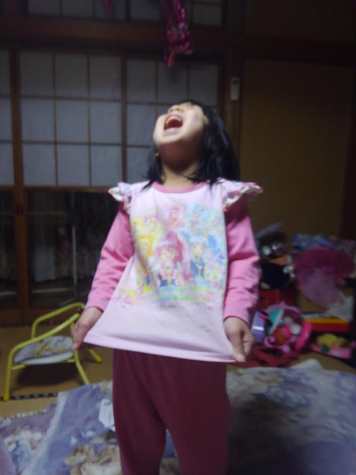 光るパジャマを光らせるべく、裾に光を当てている次女。