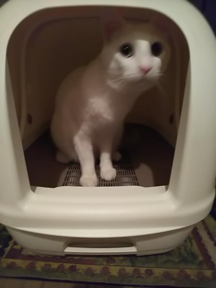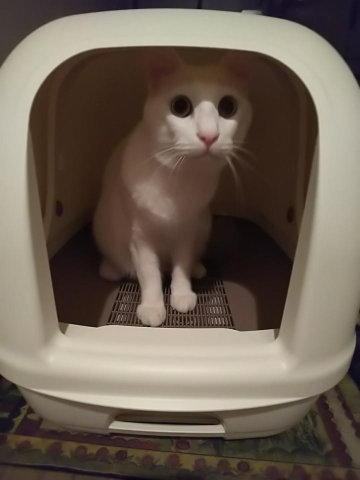 かくれんぼ?するちーちゃん。システムトイレの砂を、ポリポリすることはもうありません。