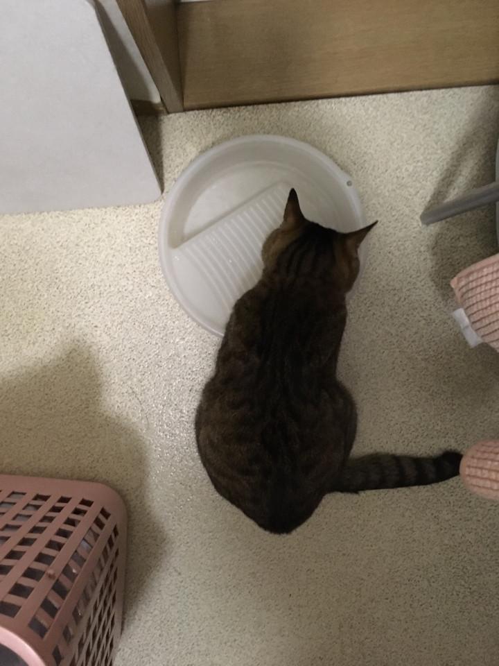 洗面所の洗いおけで飲みたがる。 何故だ?⁇ 匂い?温度?分からん!⁇