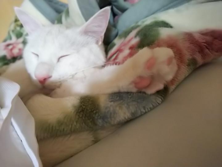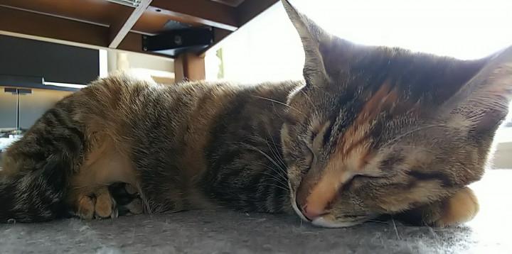 レーズンちゃんは、高い所に登れないようで、カーペットで寝たり猫ベッドで寝たりしています。