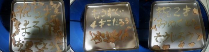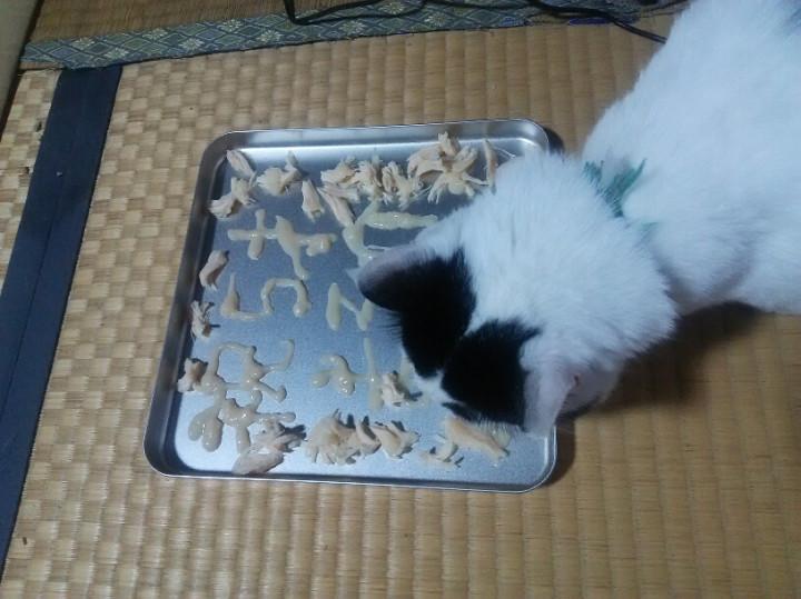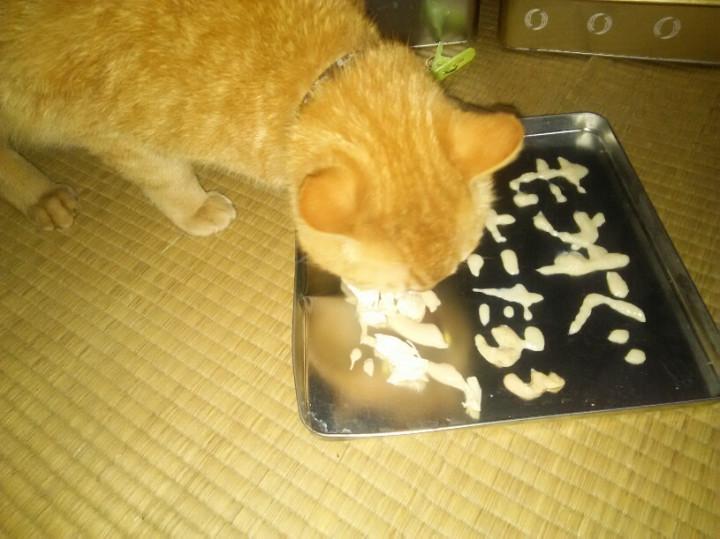 おめでとう そうじろう」とちゅーるで書き、ササミで軽くデコレーションしましたが、出来は