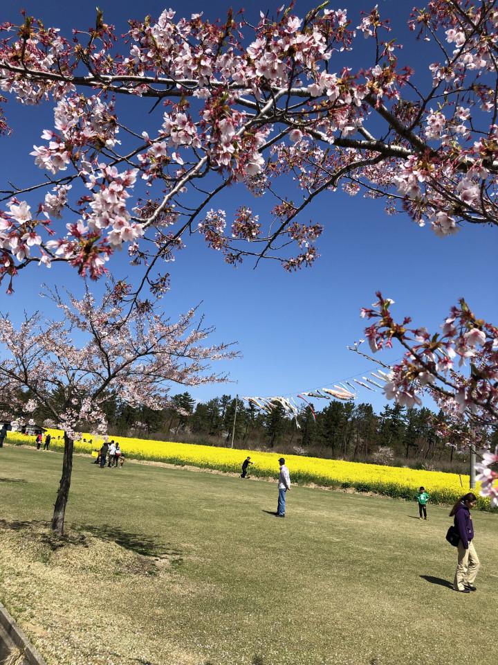 青空、桜、菜の花、鯉のぼりのコラボです。
