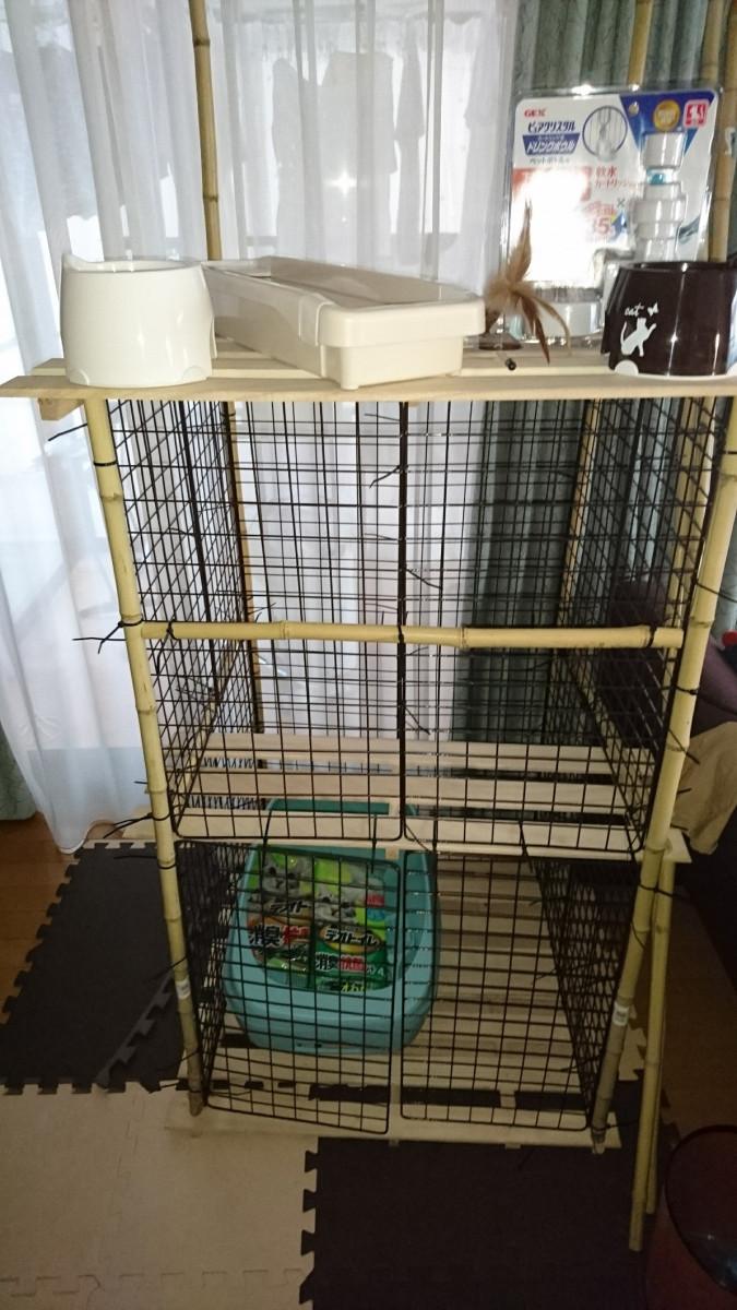 トイレを2個、フィルタ付きの給水器?、エサ皿2個におもちゃを一つ、爪とぎをとりあえず一つ。