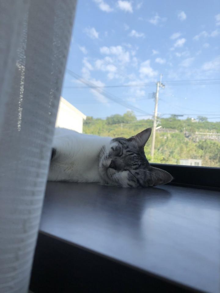 ポカポカ陽気の昼下がり、出窓でおねんねのゆずさん。
