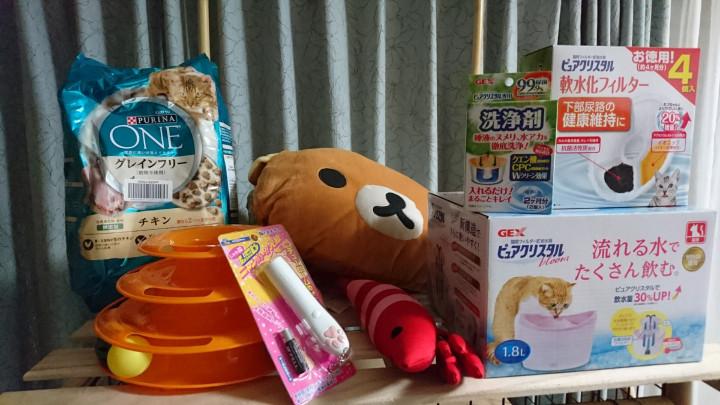 フィルター付きの給水機を2個、爪とぎ、ブラシ。