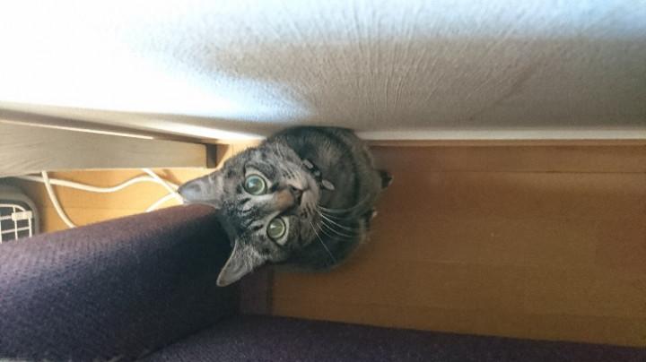 ケージのドアを開けたままにしておいたら、ソファーの下に隠れ先を変更したご様子。