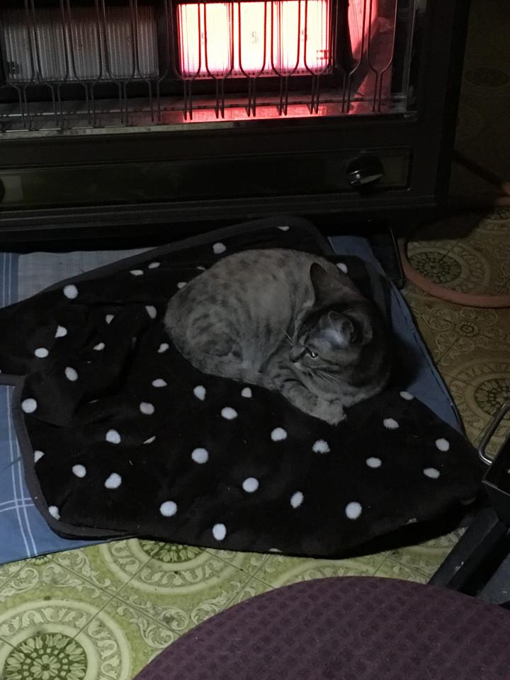 寒いって、ストーブ点けさせられた。