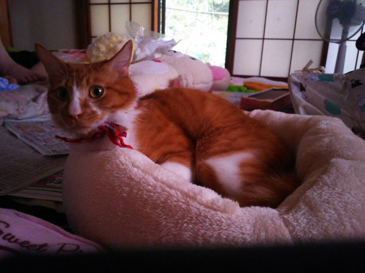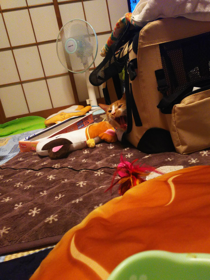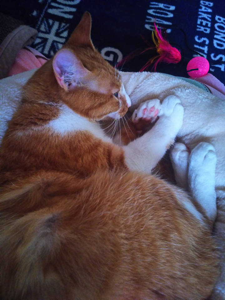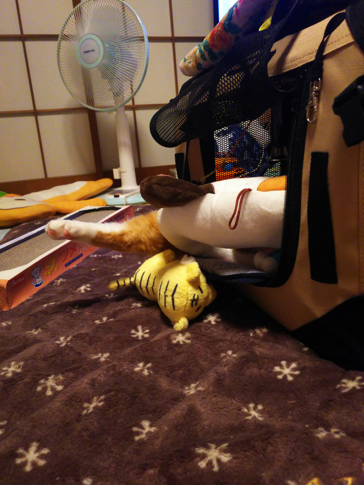 キャットタワーには相変わらず登らないんで、1番上の寝床を取外して、床に置いてみたら、居心地良いみたいで、ぐっすり眠ってら〜良かった♪良かった♪