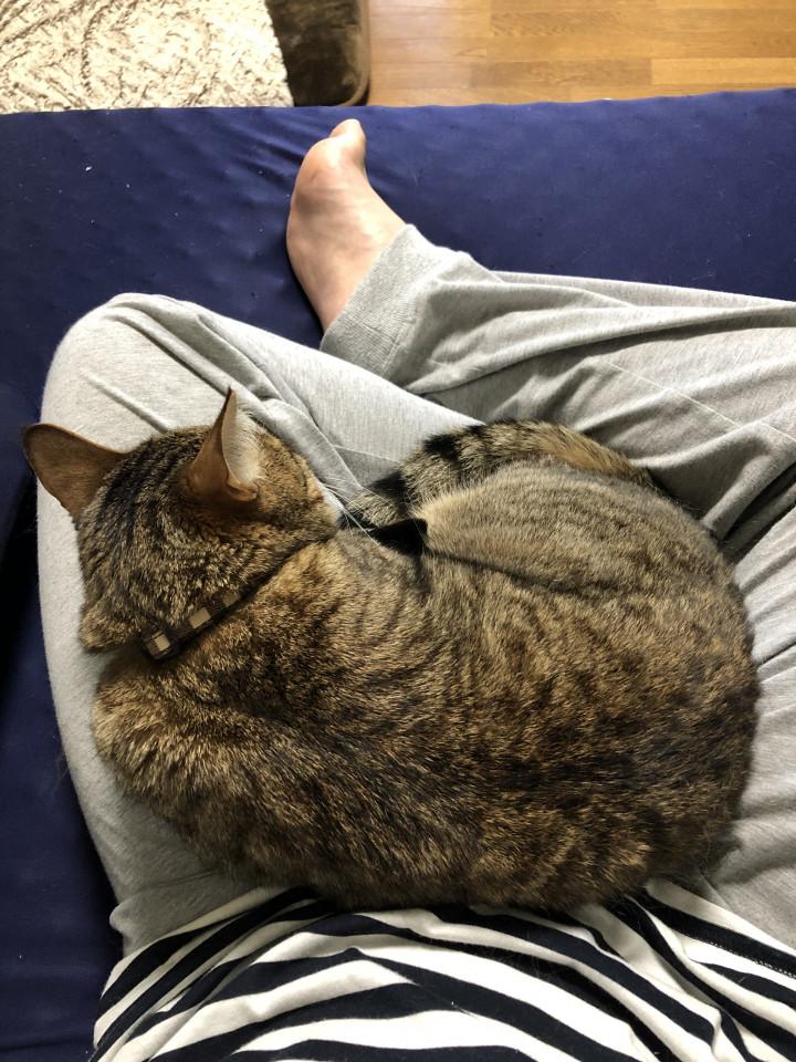 飼い主は、シオンが寝ているので、安眠を妨げるのも忍びないので、この状態で本読んだり、スマホ弄ったりしてます。