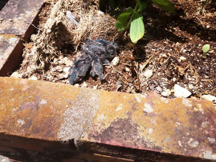 崩れた巣のそばに 固まった4羽のひな団子~🐤🐤🐤🐤