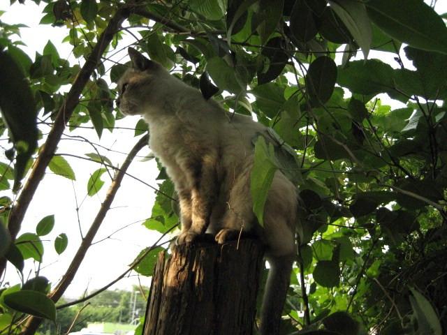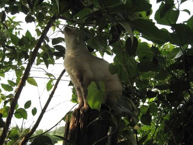 ノンちゃんは、以前、父にばっさり切られたサワラの木に登っています。