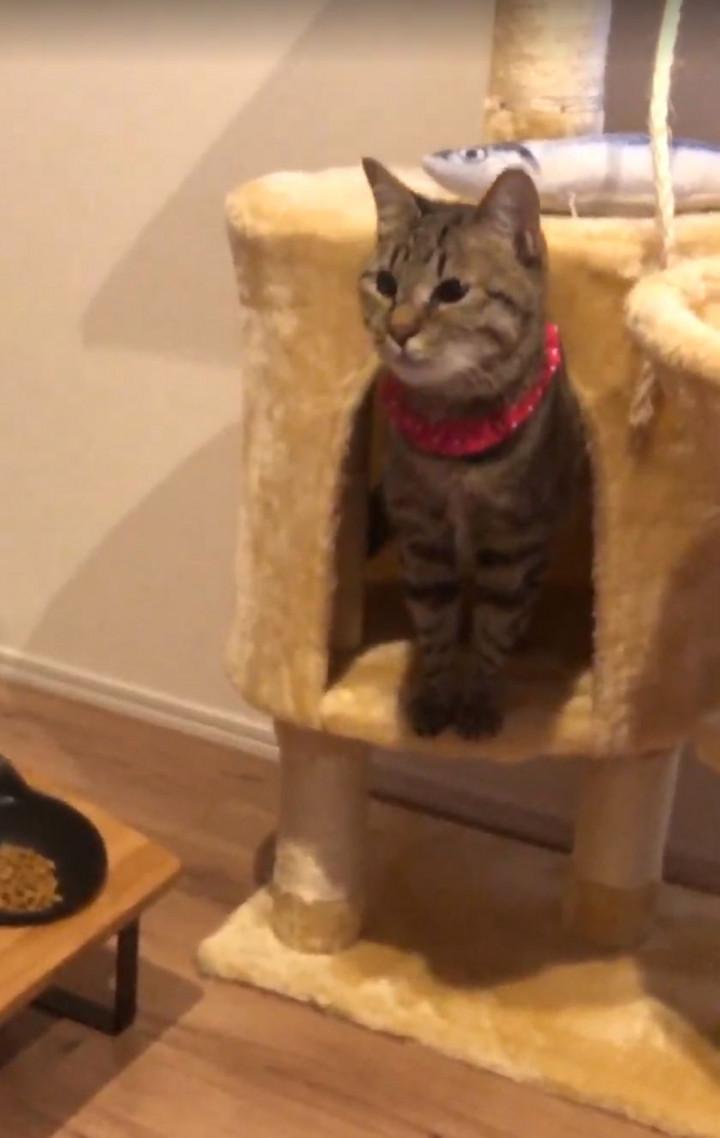 リビングを軽く一周する中で、キャットタワーにも気づくとタワーのお家状になった中に入ってみたり。