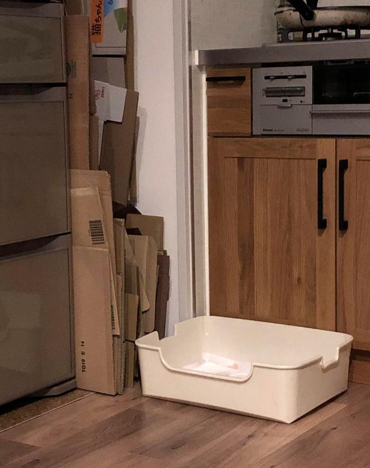 トイレはオシッコのニオイがついたシートをせっかくだからそのままに、汚れた部分にトイレットペーパーを置いておいたけど。その中がトイレだと思ってくれるだろうか。ってかコンロの前って邪魔だけど(笑)。ここがトイレの定位置になるのも、それはそれでちょっとアレだな(笑)。
