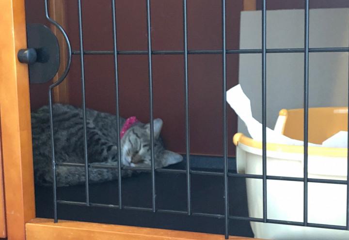 ケージ、一番下のトイレの段から入れたのだけど、そのままその段の隅っこに行って縮こまって寝てる。