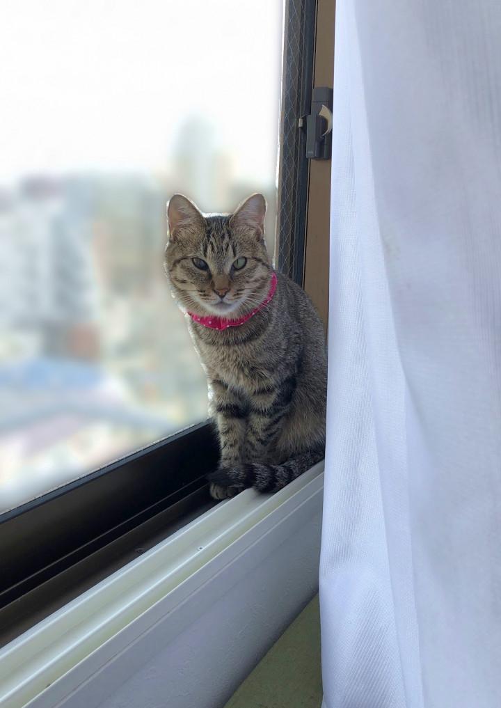 やがてぽてはソファの背のカーテンをくぐり、窓辺に。