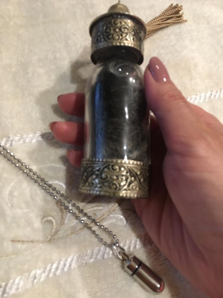 火葬の前日、私の愛の塊であるこの子の体にもう触れる事が出来ないのだ、と思うと胸が張り裂け、泣きながらあの子の毛をチョキチョキとハサミで切りました、、ゴロゴロと喉を鳴らす柔らかでフワフワな毛、お腹の毛、尻尾の毛、、と体中万遍なく、少しずつ瓶に詰め、瓶をいっぱいにしたのです。瓶を開けてはあの子を感じ、、、あの子の匂いを感じ、収骨の際には、ロケットのペンダントに可愛い尻尾の先端と、いつも