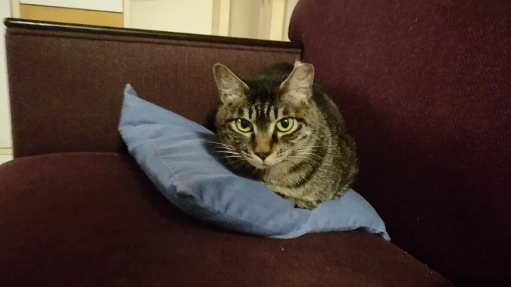 昨晩は、私がリビングで料理しつつテレビ見たり、その後近くで食事していても、ケージに戻ったりすること無く、ソファーに置いたクッションの上でくつろいでくれていました。
