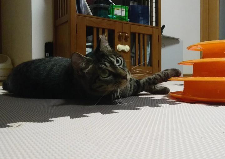 私が寝るために部屋を出るまで、ずっとケージには戻らずソファーやキャットウォークに行ったり、おもちゃで遊んだり、でした。