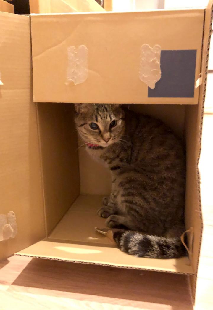 8時過ぎ投薬後、部屋の中を探索モードに。転がってたダンボールに入るという猫らしい行動も見せる。
