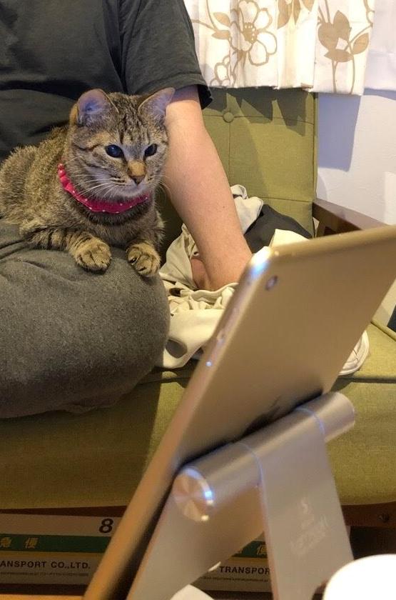 「ぽて、おいで!」こっちの膝にも来て甘えるぽて。かわいいなぁ、ホントに。
