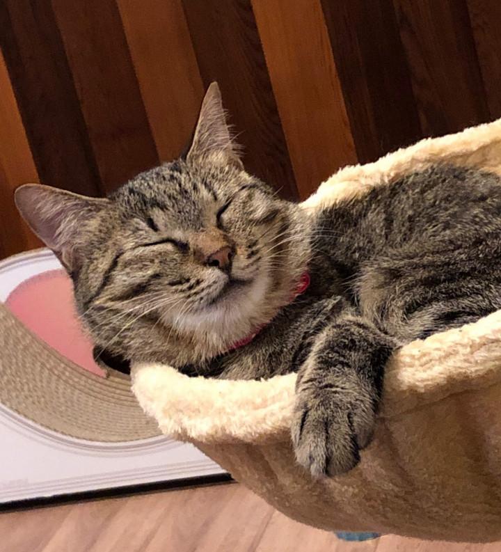 そしてタワーの寝床に入り、しばらく丁寧にグルーミングをして、おやすみ。
