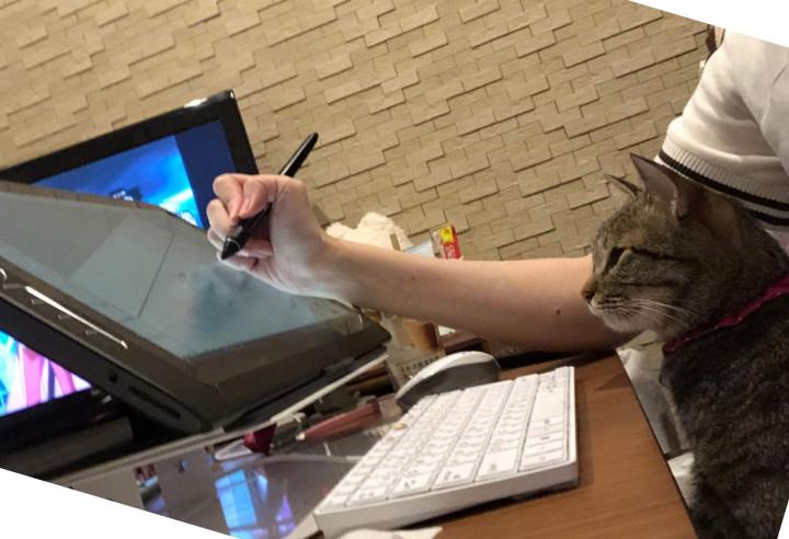 私が仕事に使ってる液晶タブレットの画面にも興味深げ。