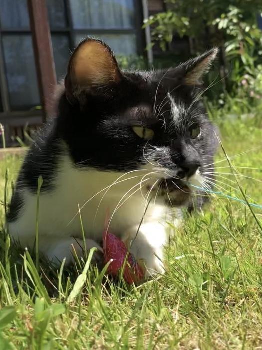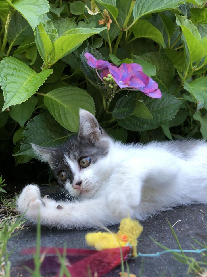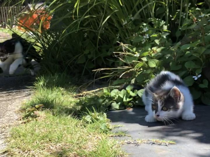 一人になった子猫はんはなは、のらこがそばにいる時は元気に庭を走り回り、おもちゃのかしゃぶんにも少し振るだけですぐに飛びついてくるようになりました。