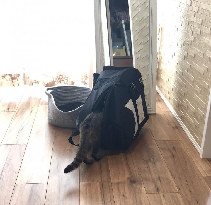 猫壱のキャリーリュック(新品)を倒してみると、少し入ったり。