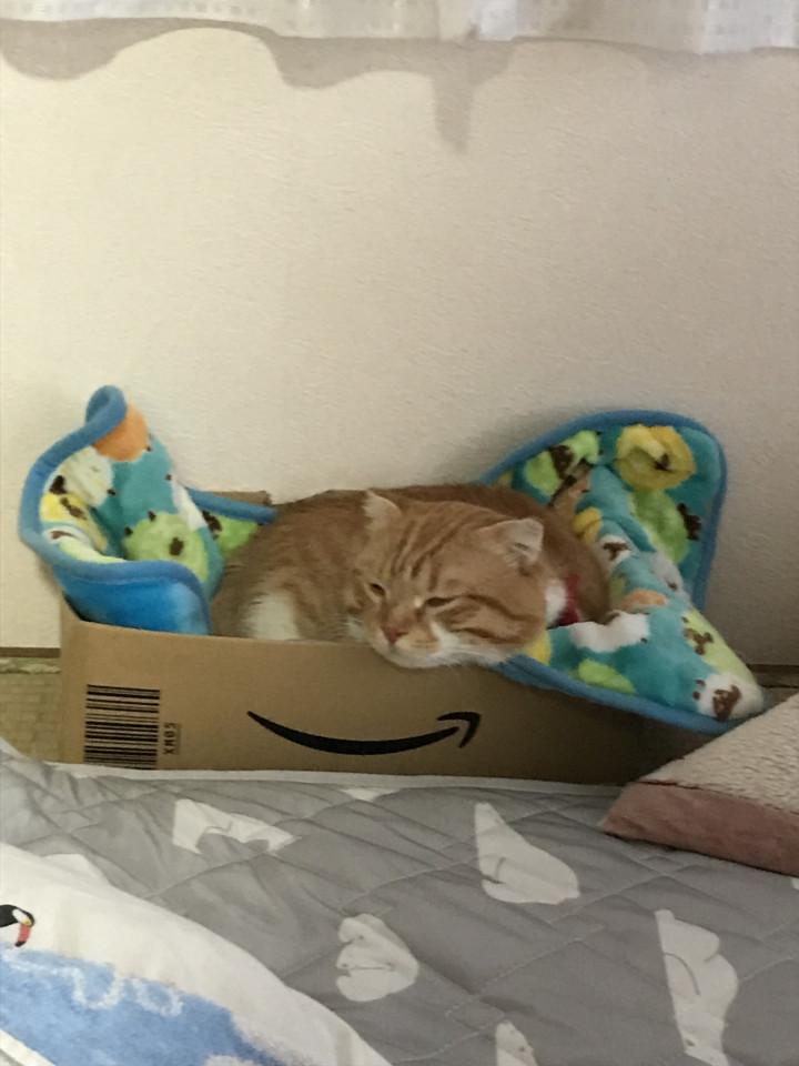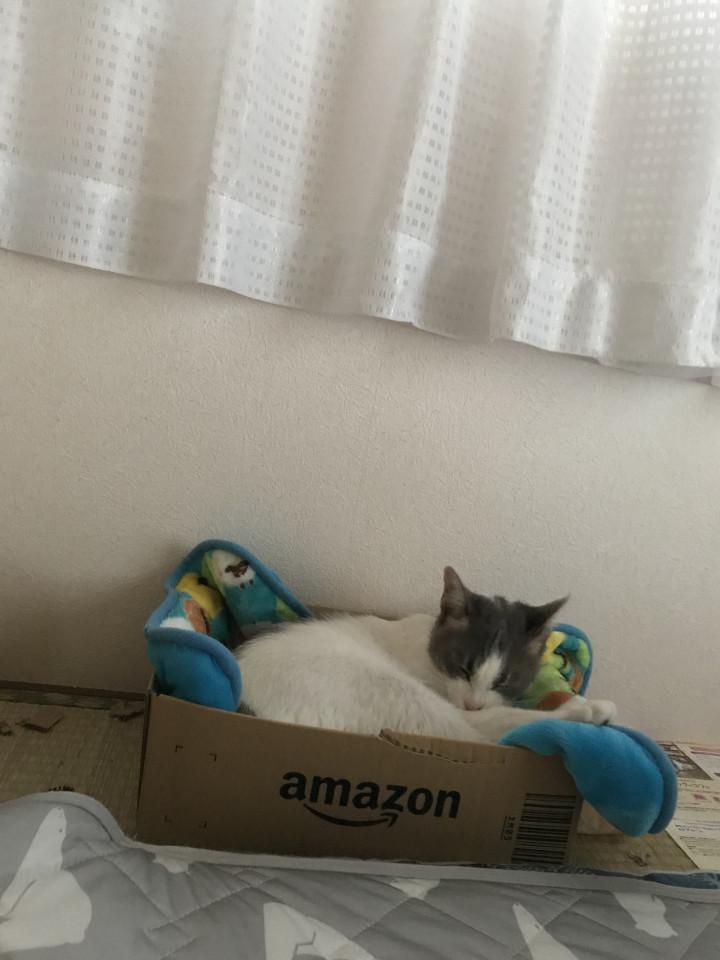 ミルクのお気に入りのダンボール ママの隣で寝んね