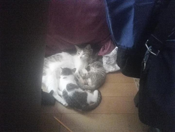 子猫達がうろうろしていると頭を叩きます 猫達は直ぐにすき間に隠れるものや気にせずにウロウロするものいろいろです