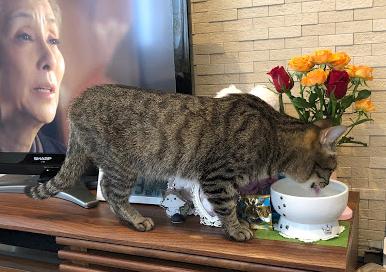 (↑テレビを楽しんでゆめの水で喉を潤す自由なぽて。首輪ナシのワイルドなお姿)