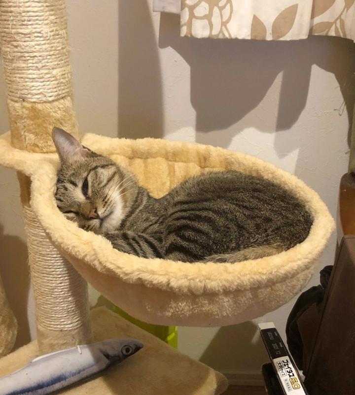 そしてゴハンを少し食べると、またタワーの寝床でおやすみに。