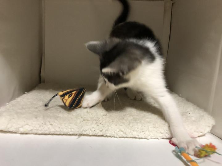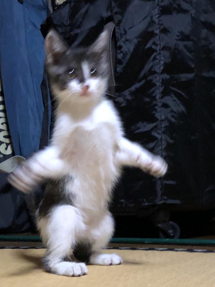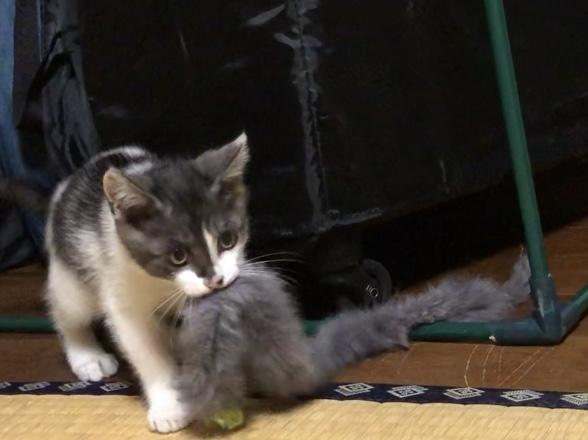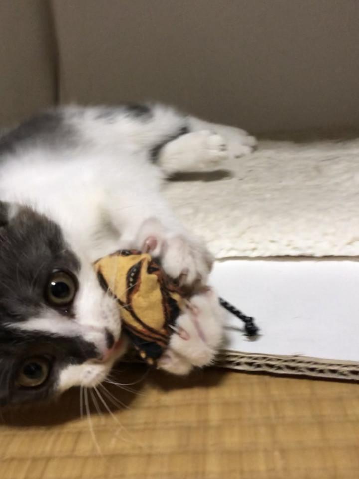 最初こそ控えめにテイテイする程度でしたが、だんだんと楽しくなり、あっちにもこっちにもあるおもちゃに目移りし、あれで遊んでいたと思ったらこっちに飛びつき、おもちゃを咥えてスーツケースの下に潜り込み、段ボール箱にかけた布に戦いを挑み、ブラインドの紐にアタックし、箱の山を登り、とにかく楽しくて楽しくて、楽しすぎて壊れてしまいそうでした。