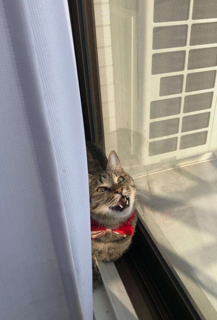 10:50、日向ぼっこのためソファの向こうの窓に行くのだけど、カーテンをめくることを夫にニャッと要求。