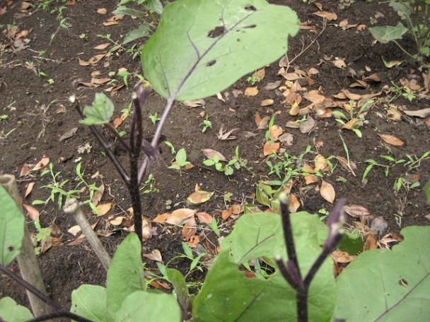 朝八時ごろ家庭菜園を見ると、ナスの苗が少し齧られていました。
