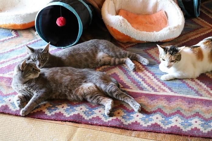 猫部屋という仏間に敷いてあるラグに行くと、ひなちゃん あきちゃん せりちゃん リノさん