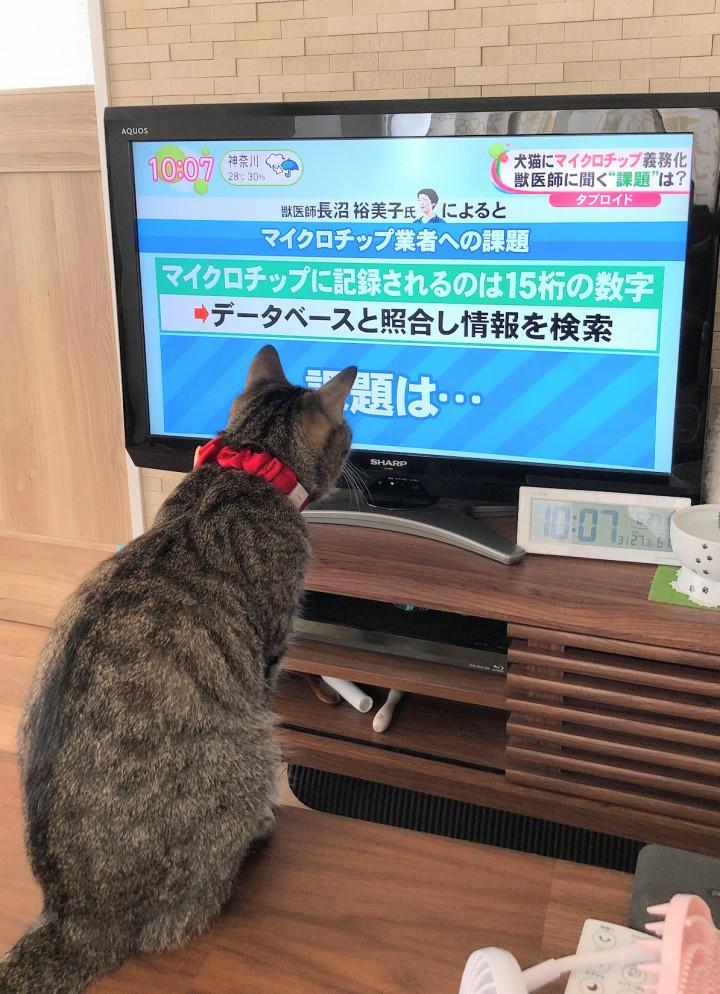 歯磨きを終えリビングの扉を開けると、ぽてはマイクロチップ義務化の解説に釘付けでした(笑)。