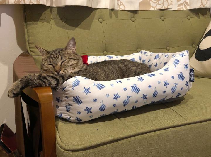 とりあえずひたすらナデナデしてたら、急に太ももを蹴って飛び降り、側に置いてあったベッドに着地。