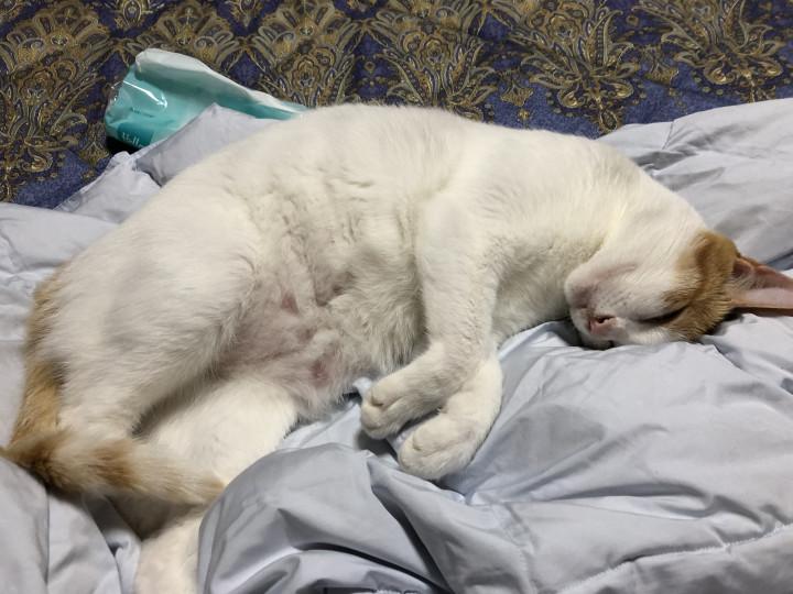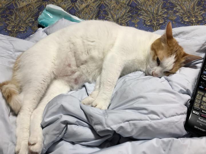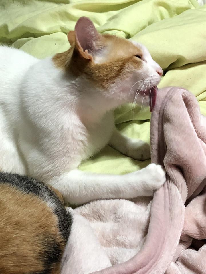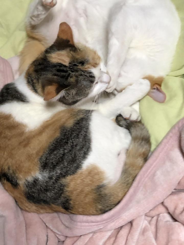 時に、タマ(三毛猫メス、4歳)の寝込みを襲撃するので、タマの逆襲に遭い、羽交い締めされます。