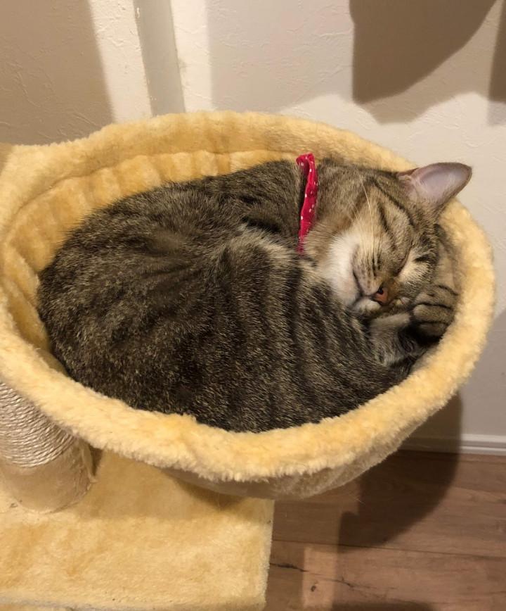 今日は朝から起きてる時間が長かったけど、スタッフさんたちが帰宅した後、タワーの寝床で本気寝に入り、